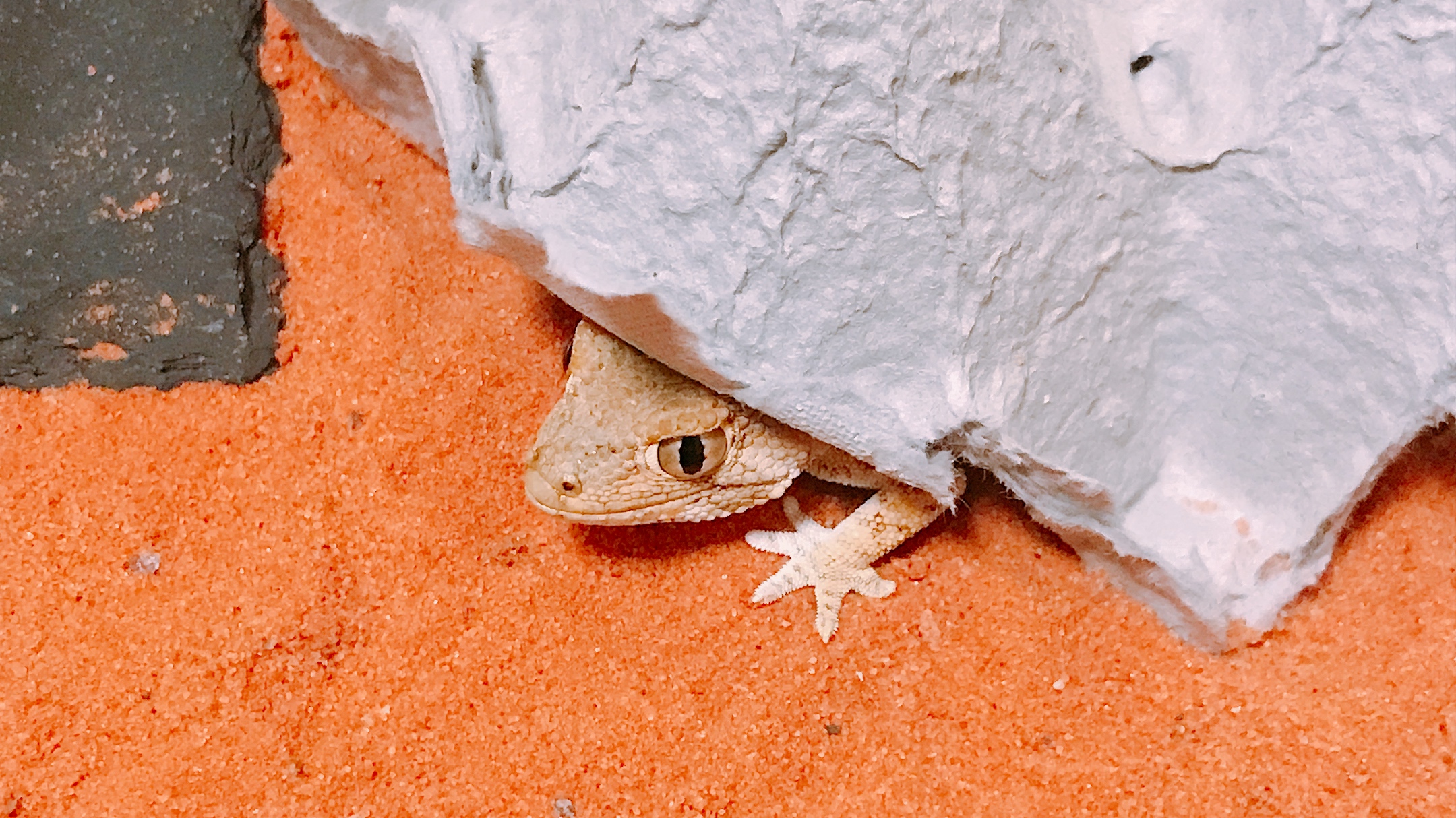그리고 헬멧티드 게코는 소형 종이기 때문에 겁이 많아서 최대한 많은 은신처를 넣어줘야 한다고 들었는데 이 친구는 저한테 이제 익숙해진 건지 아니면 원래 높은 곳을 좋아하는지 밥만 주려고 하면 오히려 더 분주하게 이리저리 돌아다니면서 은신처 위를 오르락내리락한답니다. 그리고 얼마 전에는 은신처 위에서 사육장 밖으로 탈주 시도를 한 적이 한번 있었는데요, 다행히 모래 위로 착지한 채 실패로 끝났고 그 뒤로는 은신처에서 점프는 다시 시도하지 않아요.