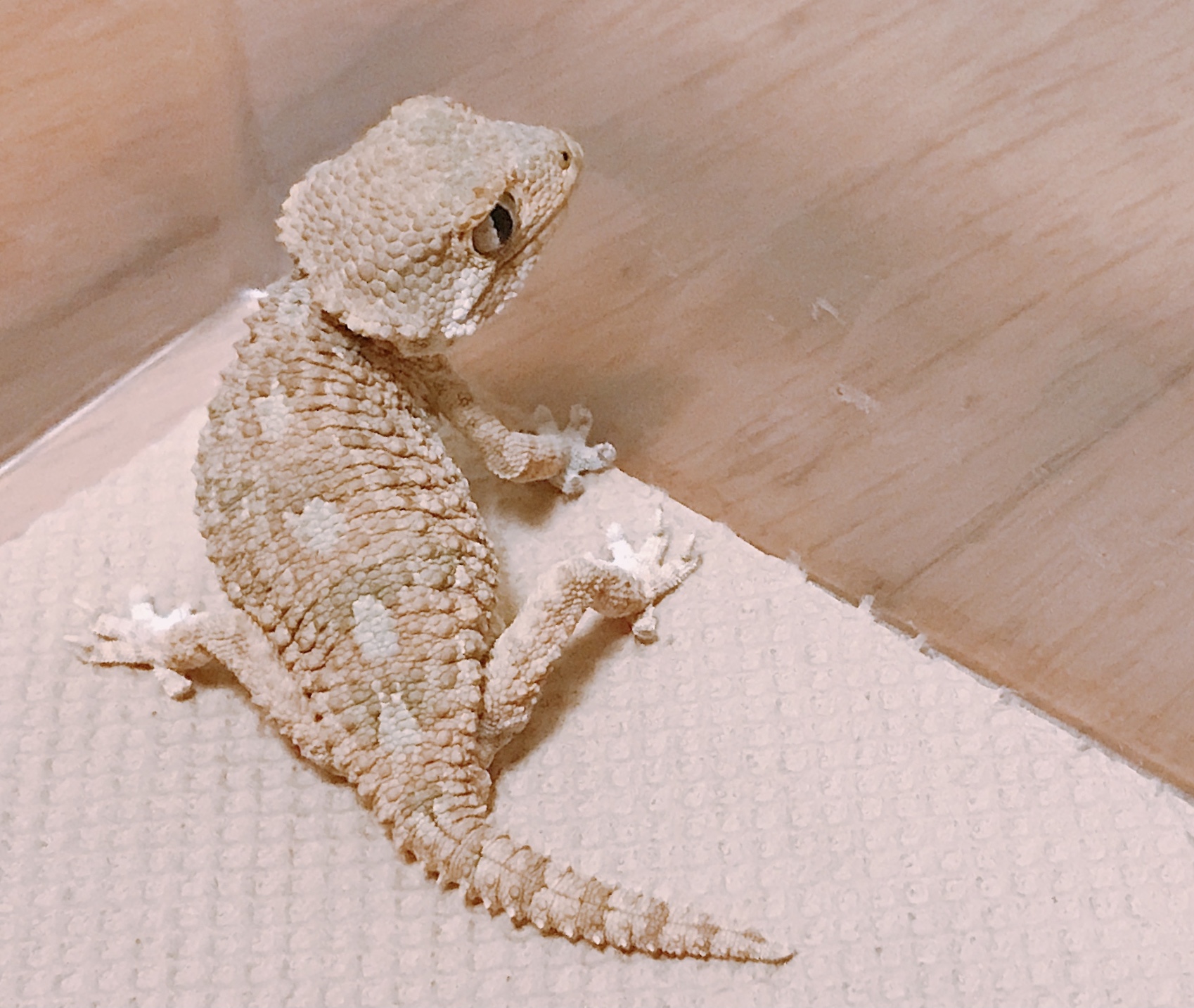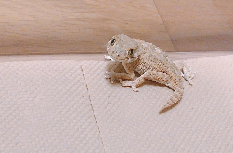 그렇게 몇 번의 시도 끝에 처음 슈푸를 할짝였을때는 아 이제 살았구나 하고 안도감이 들었답니다. 그런데 크레스티드 게코처럼 헬멧티드 게코도 이리저리 돌아다니며 밥을 먹다 보니깐 입에 묻은 슈푸때문에 입가 주변에 모래가 왕창 묻기도 하고 또 그거 정리하겠다고 혀로 할짝이다가 모래를 먹기도 해서 얼른 티슈로 닦아주긴 했는데 그래도 모래 먹는 게 신경이 쓰였어요. 물론 소량의 모래는 몸 밖으로 배출이 되는 건 알고 있지만 말 못 하는 아이들이기 때문에 혹시 배가 아픈 건 아닌가 싶어 말이죠.