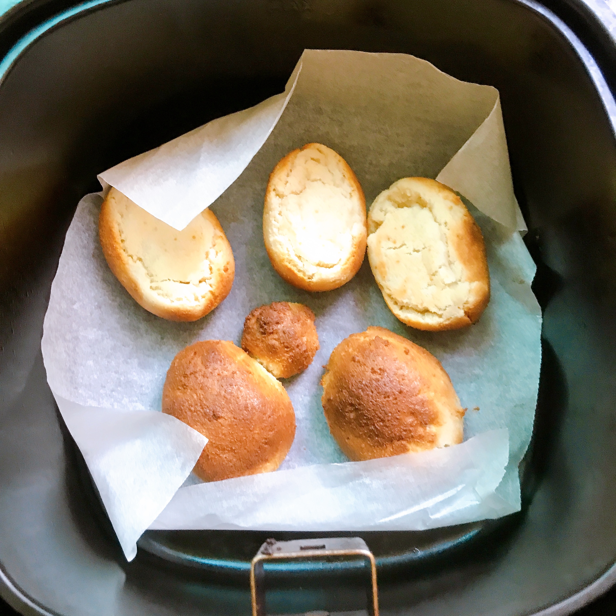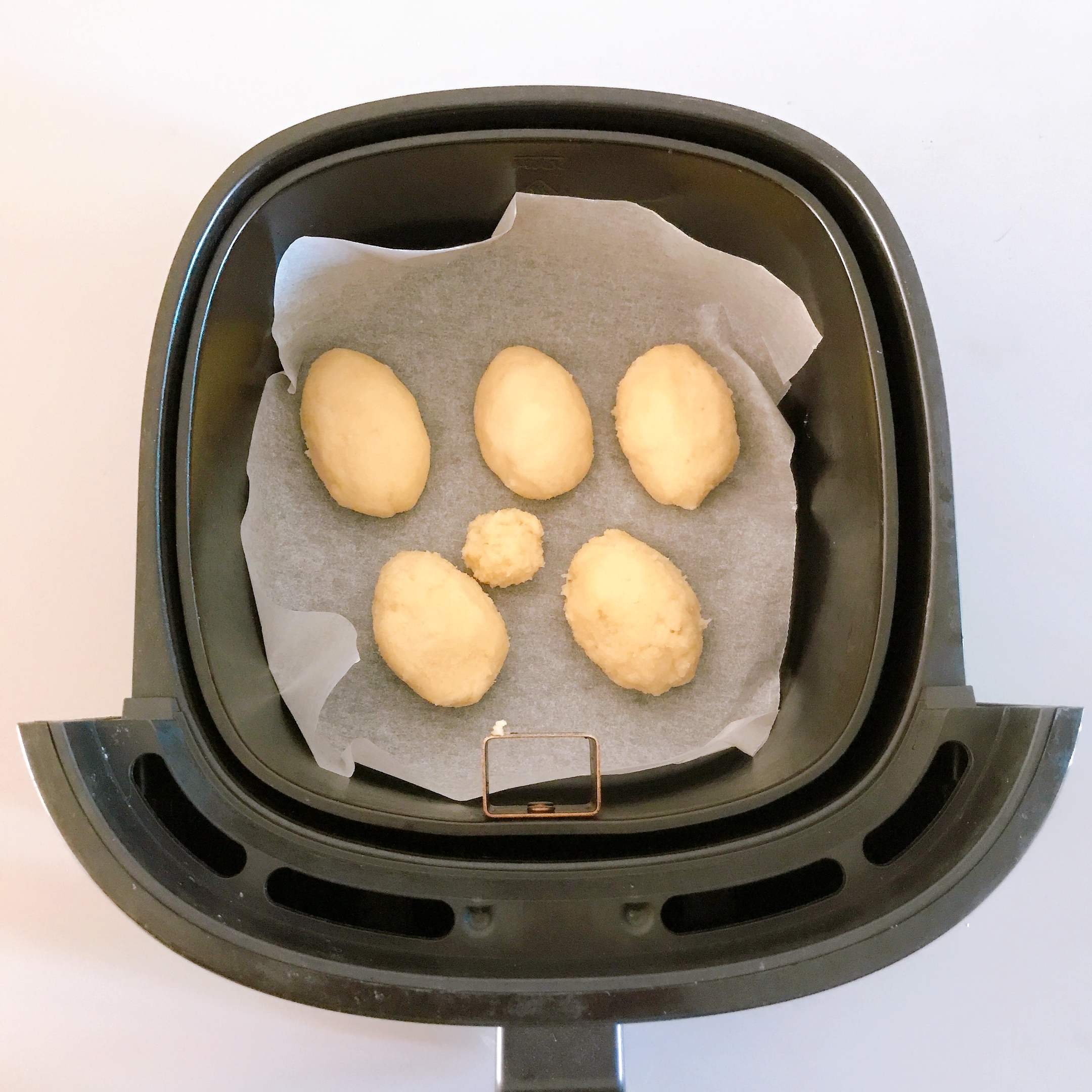 5) 먹기 좋은 크기로 빚은 빵 반죽을 에어프라이어에 넣어 줍니다. 별도의 예열 없이 윗면을 8~10분 정도 먼저 구워 줍니다.