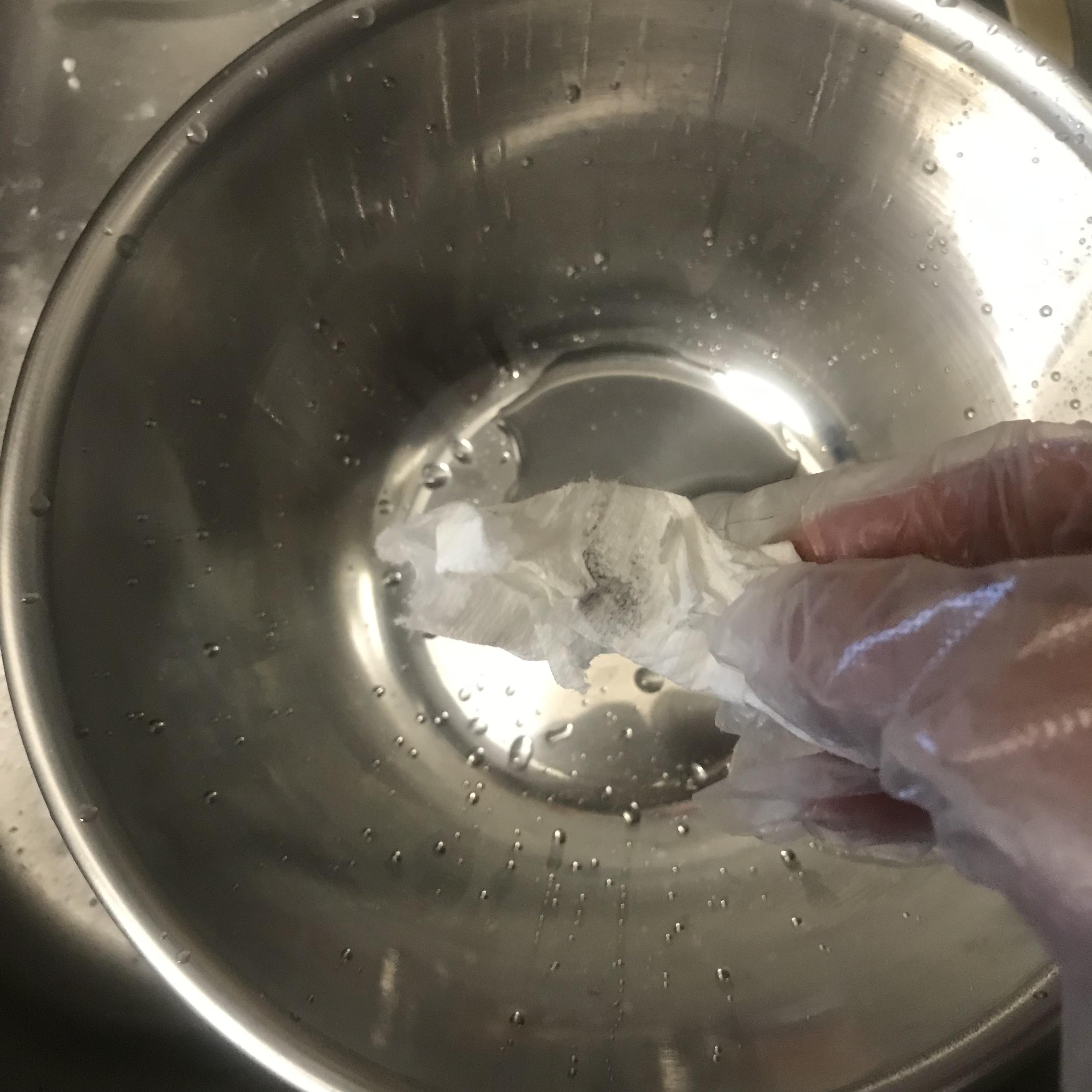 만약 큰 냄비가 없다면 싱크대에서 믹싱볼에 베이킹 소다를 뿌린 후 키친타월을 사용해 구석구석 꼼꼼히 닦아 냅니다. 이때도 역시 연마제가 묻어 나오지 않을 때까지 계속해서 반복해서 작업합니다. 베이킹 소다 작업 마무리 후 다시 한번 식용유로 확인을 하고 키친타월로 깨끗이 닦아준 후 주방 세제로 세척 후 마무리합니다.