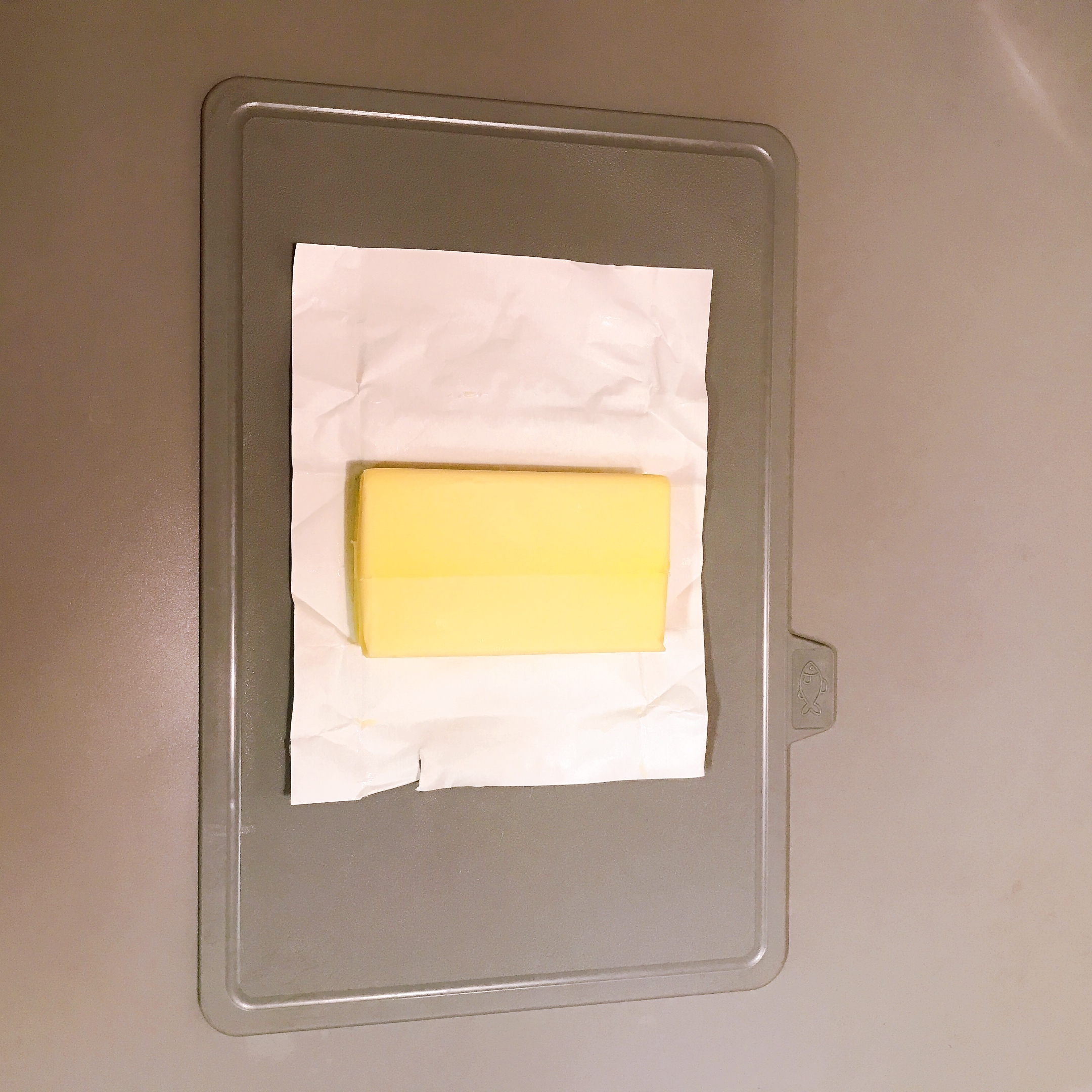 Step 2) 버터의 포장지를 벗겨 도마 위에 올려놓습니다.