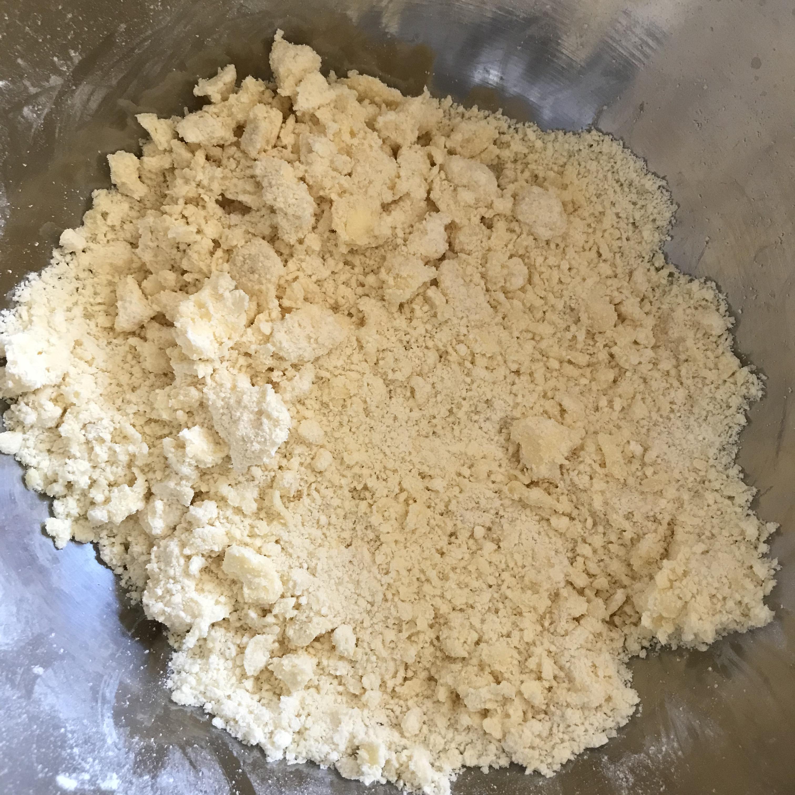1. 박력분 밀가루 (160g)에 설탕 (6g), 소금 (1/2 tsp)을 넣은 다음, 차가운 버터 (105g)를 넣고 잘 섞어 줍니다. 버터가 완전히 으깨질 때까지 잘 섞습니다.