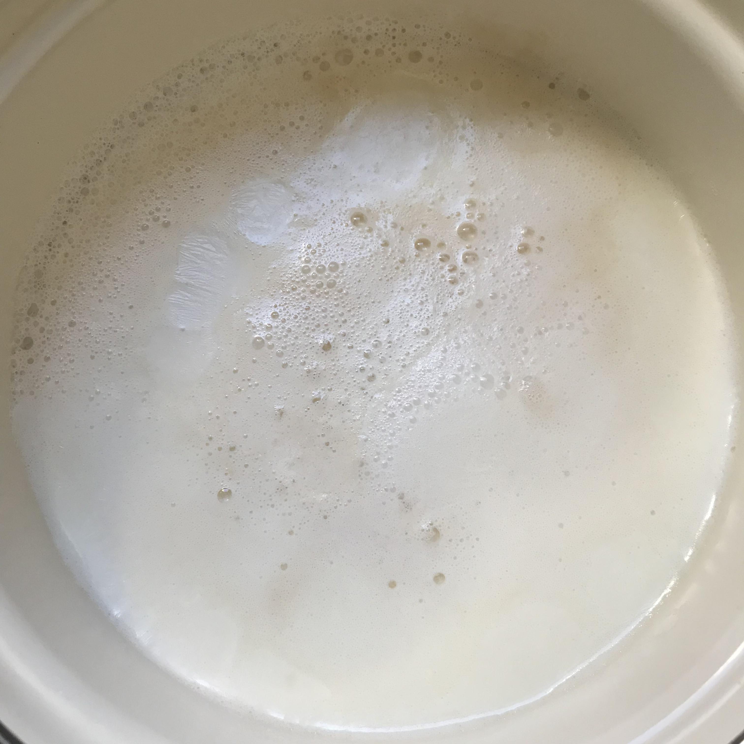 3. 기다리는 동안 에그타르트 필링을 만듭니다. 냄비에 <우유 (285g), 생크림 (165g), 설탕 (97g)>을 넣고 중불로 끓여 줍니다. 냄비의 내용물의 가장자리가 끓어오르면 불을 끄고 그대로 식혀 줍니다.