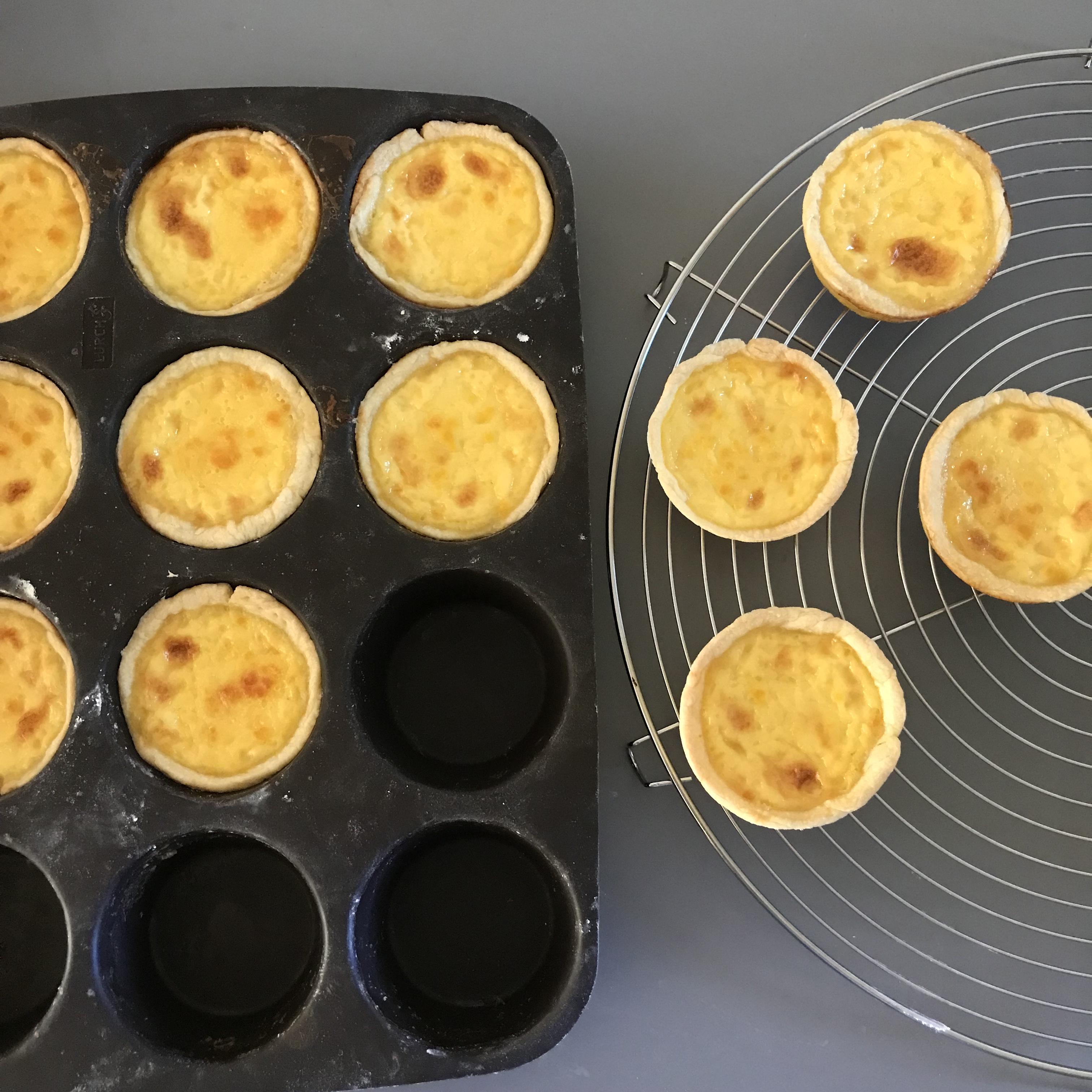 11. 다 구워진 에그타르트를 오븐에서 꺼내 머핀 틀 채로 한 김 식힙니다. 필링이 어느 정도 굳어지면 하나씩 몰드를 아래쪽에서 밀어서 에그타르트를 분리합니다.