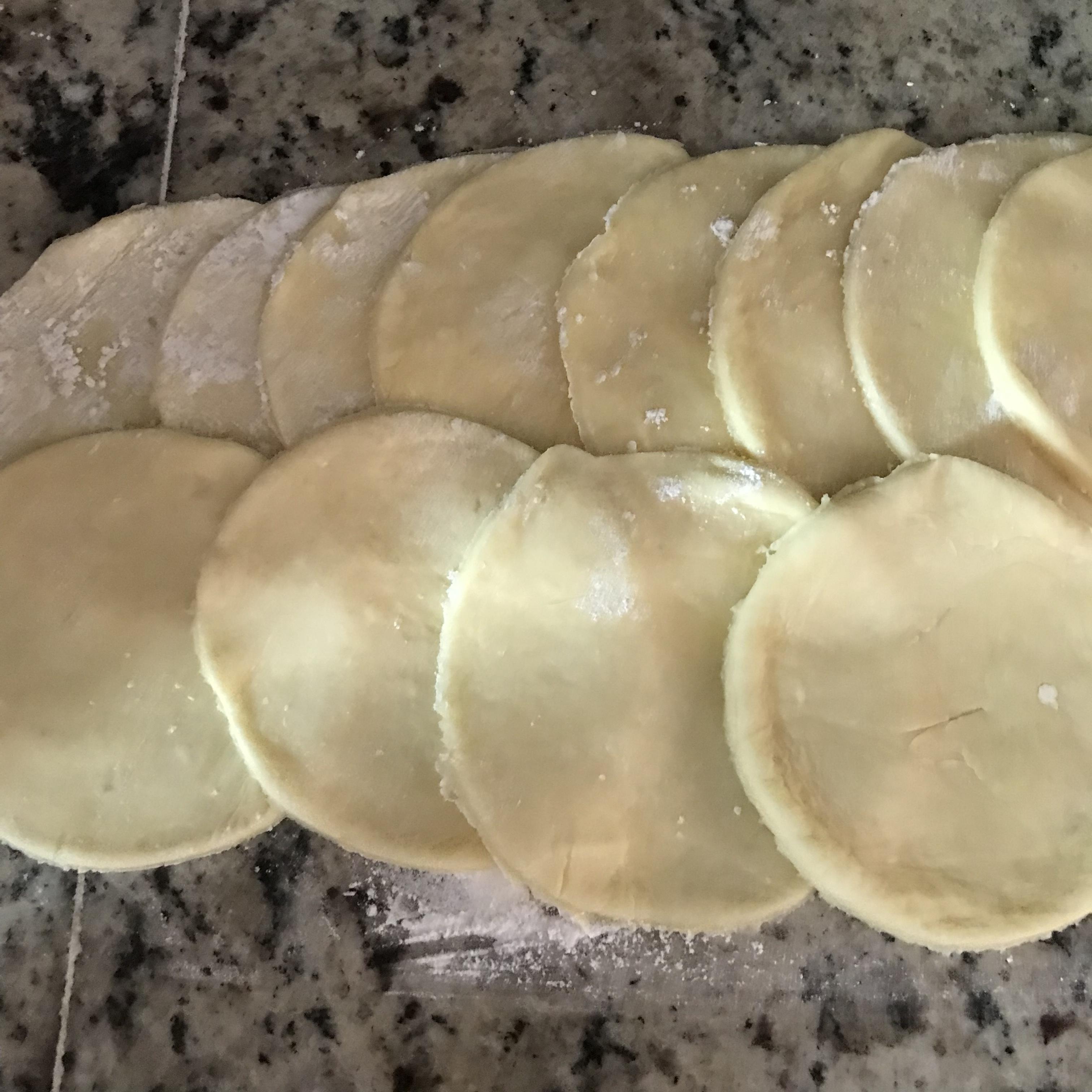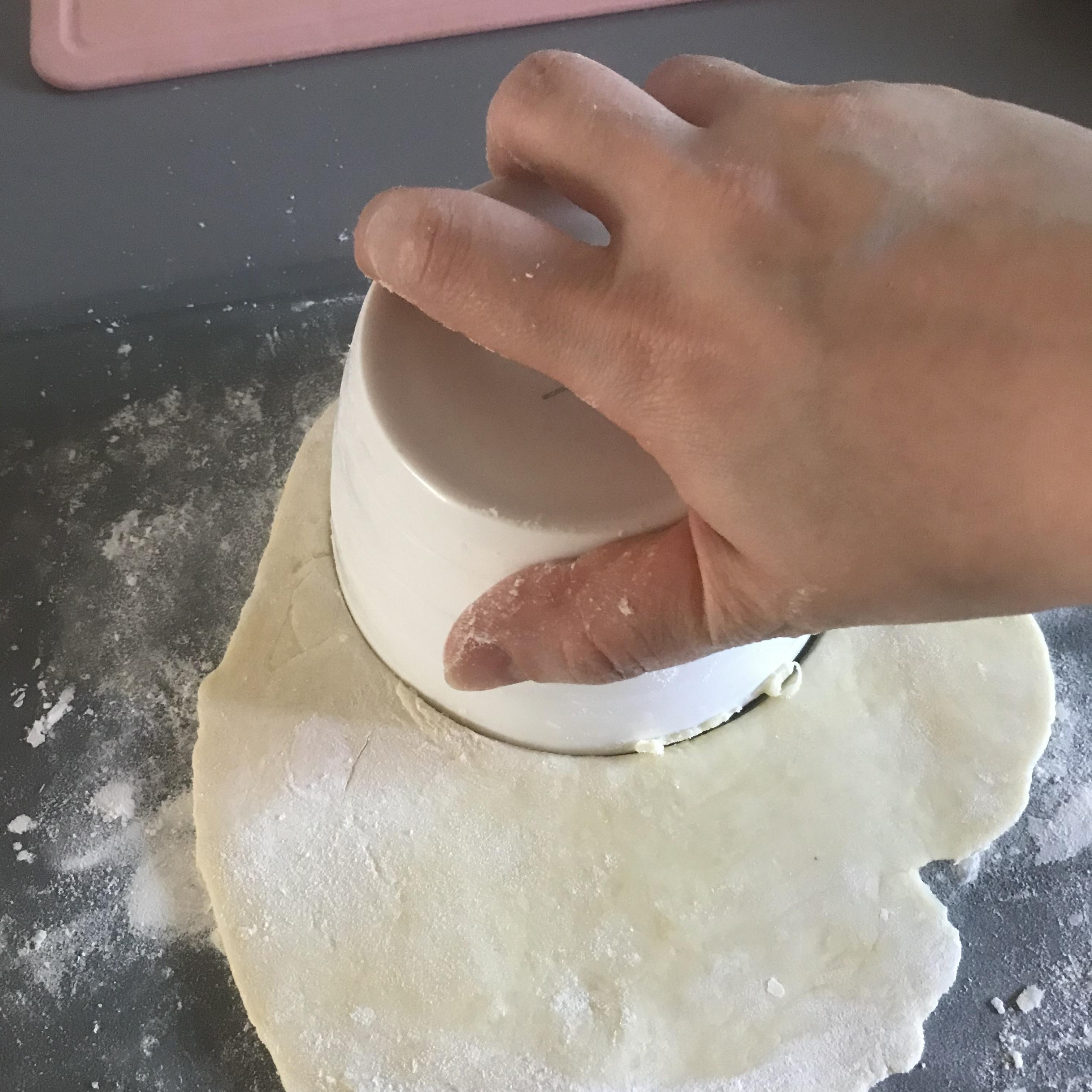 5. 적당량의 반죽을 떼어내 밀대로 민 다음, 반죽 위에 밥그릇 얹고 좌우로 트위스트 해서 반죽을 잘라 줍니다. 완성된 반죽을 겹쳐 한쪽에 둡니다.