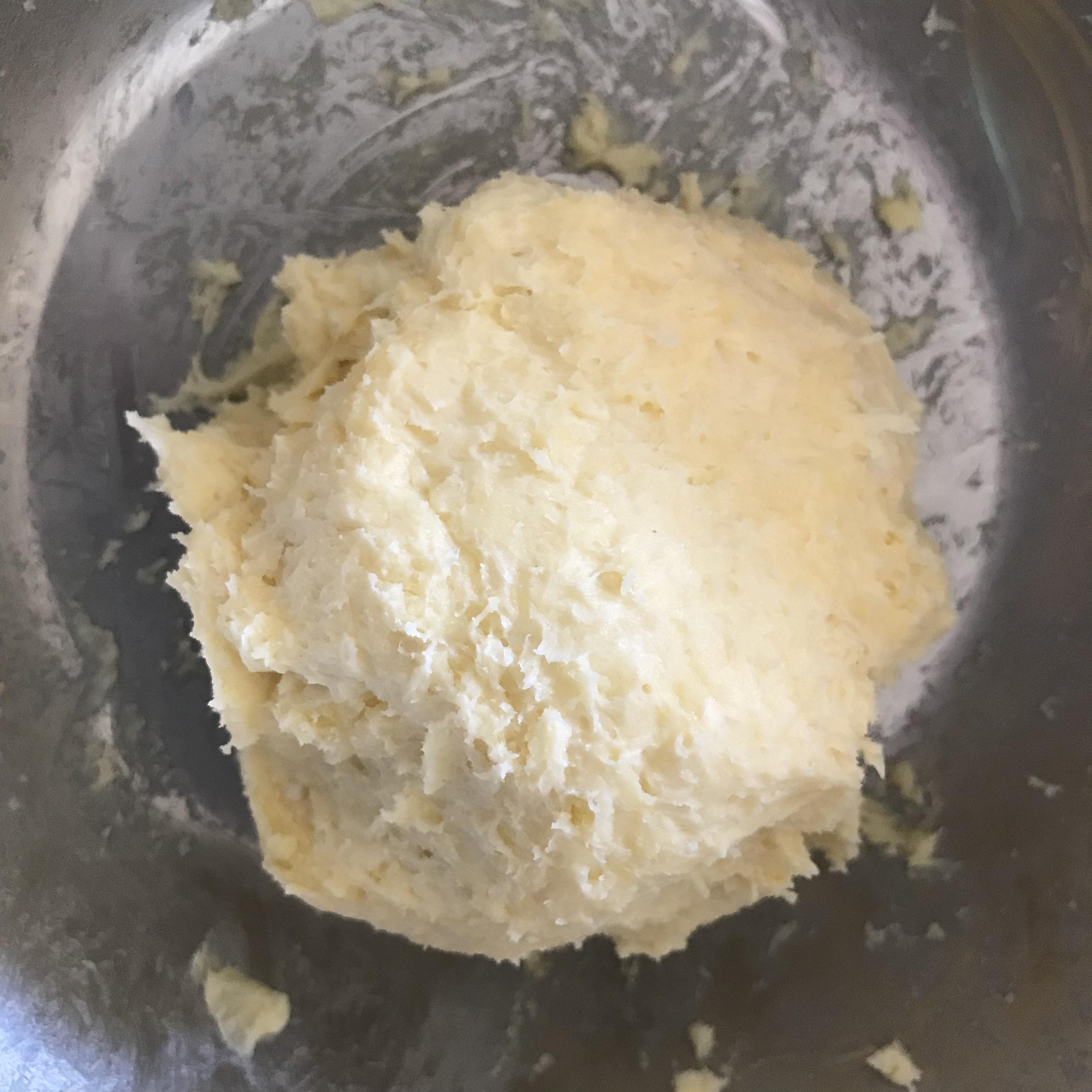 2. 위 반죽에 차가운 물 (55g)을 넣고 잘 섞어 반죽을 완성합니다, 완성된 반죽을 비닐이나 밀폐용기에 담아 냉장고에 30분간 넣어 둡니다.