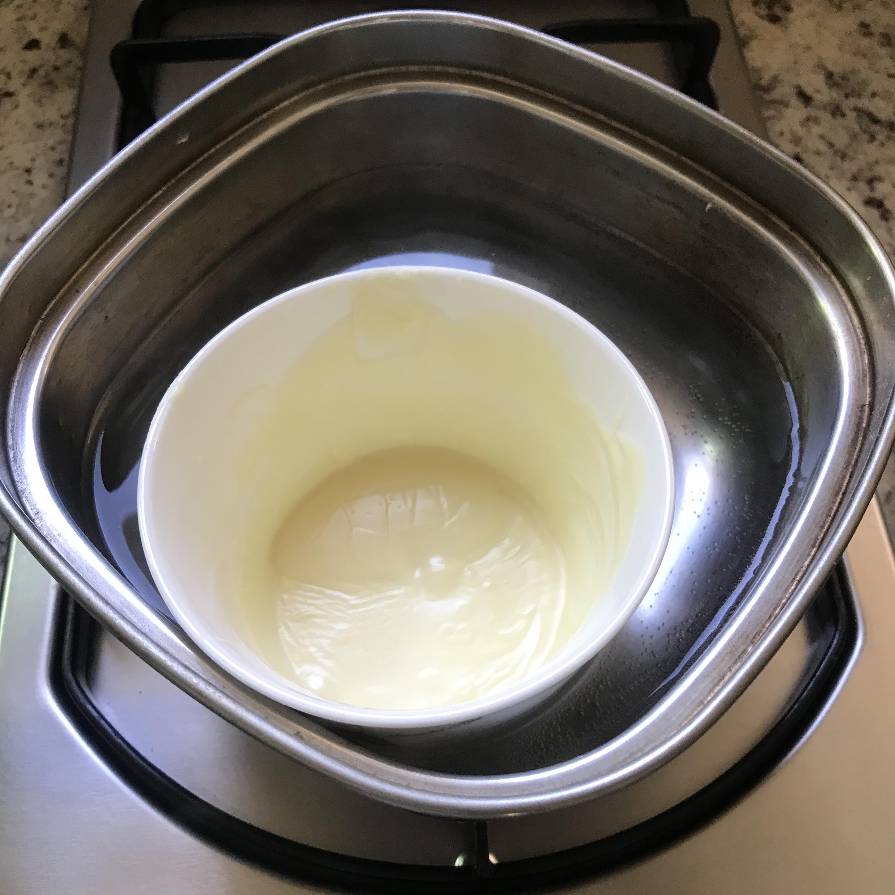 Tip. 냄비의 물을 넣고 그 위에 밥그릇 띄운 후 화이트 초콜릿을 넣습니다. 약한 불로 가열해야 초콜릿에 기포가 생기지 않습니다.