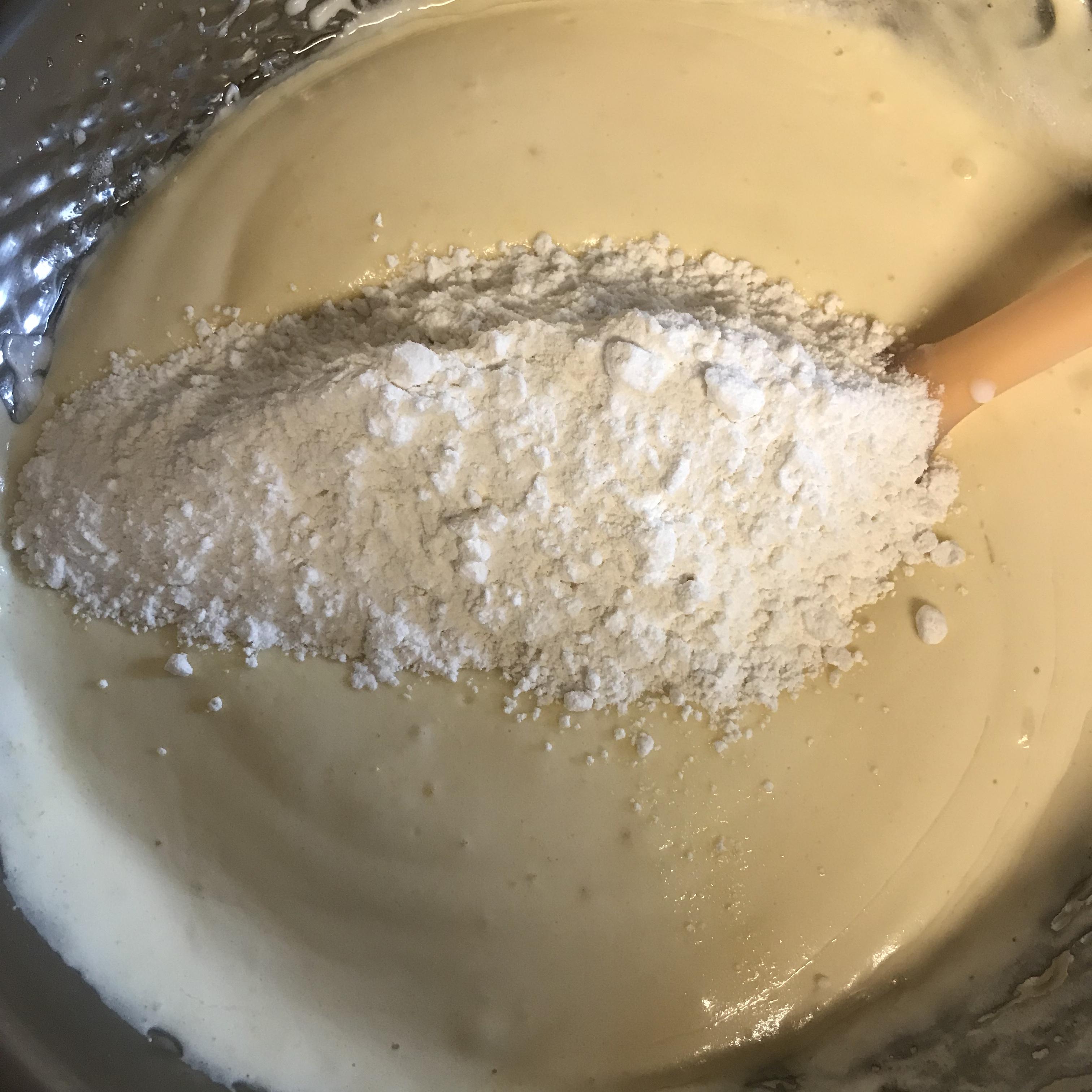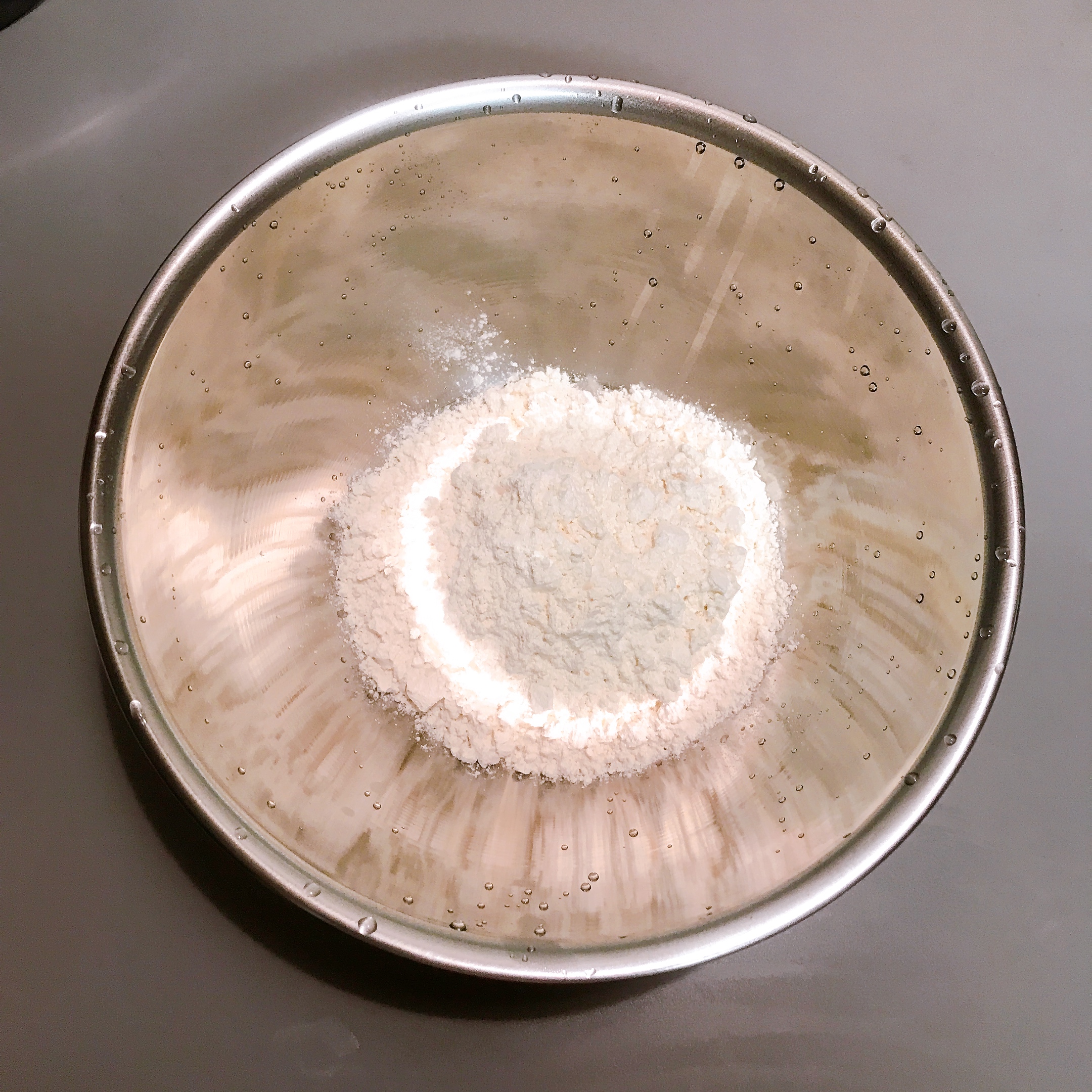 1. 박력분 (130g)과 베이킹파우더 (1g)을 2~3번 체에 거른 후, 믹싱볼에 담아 둡니다.