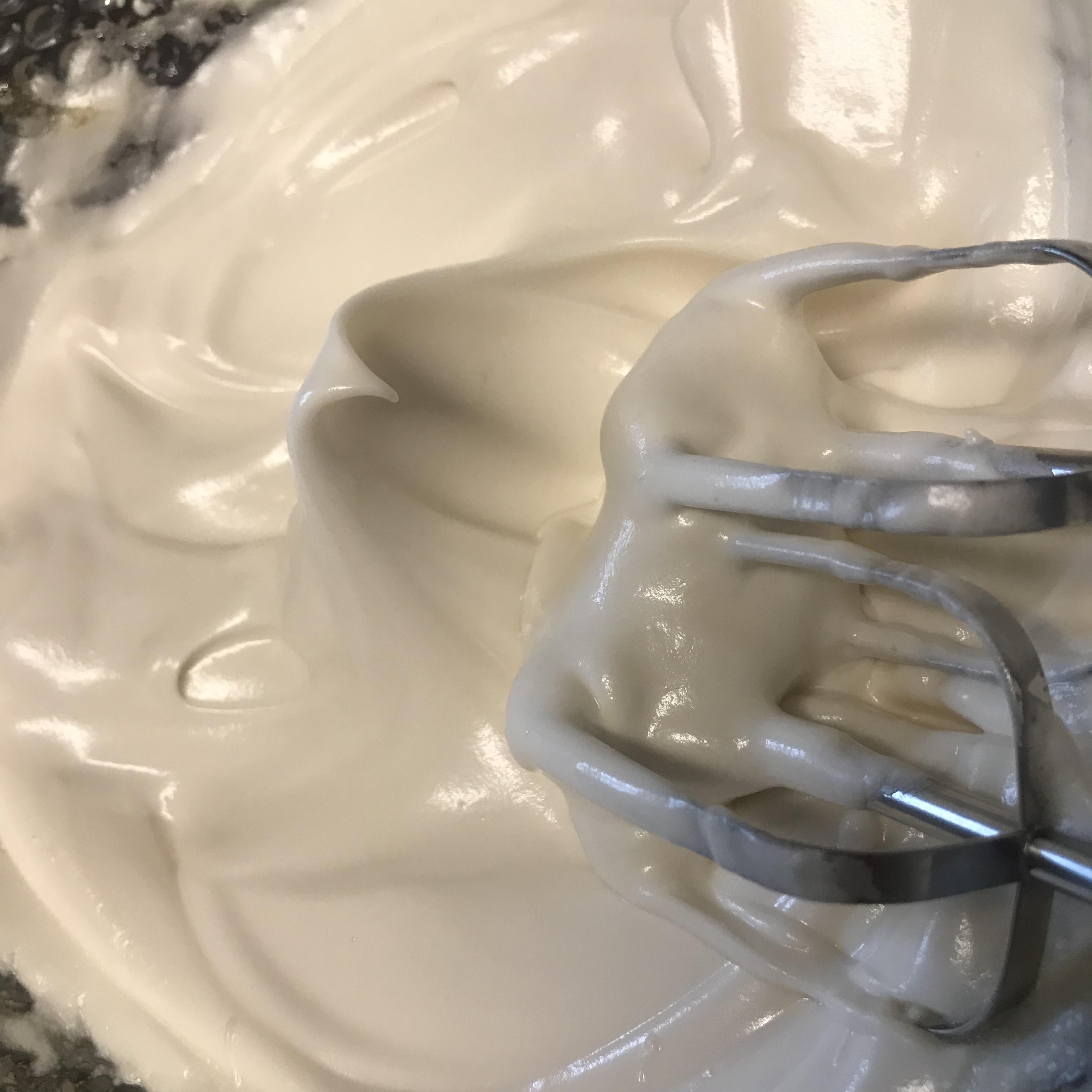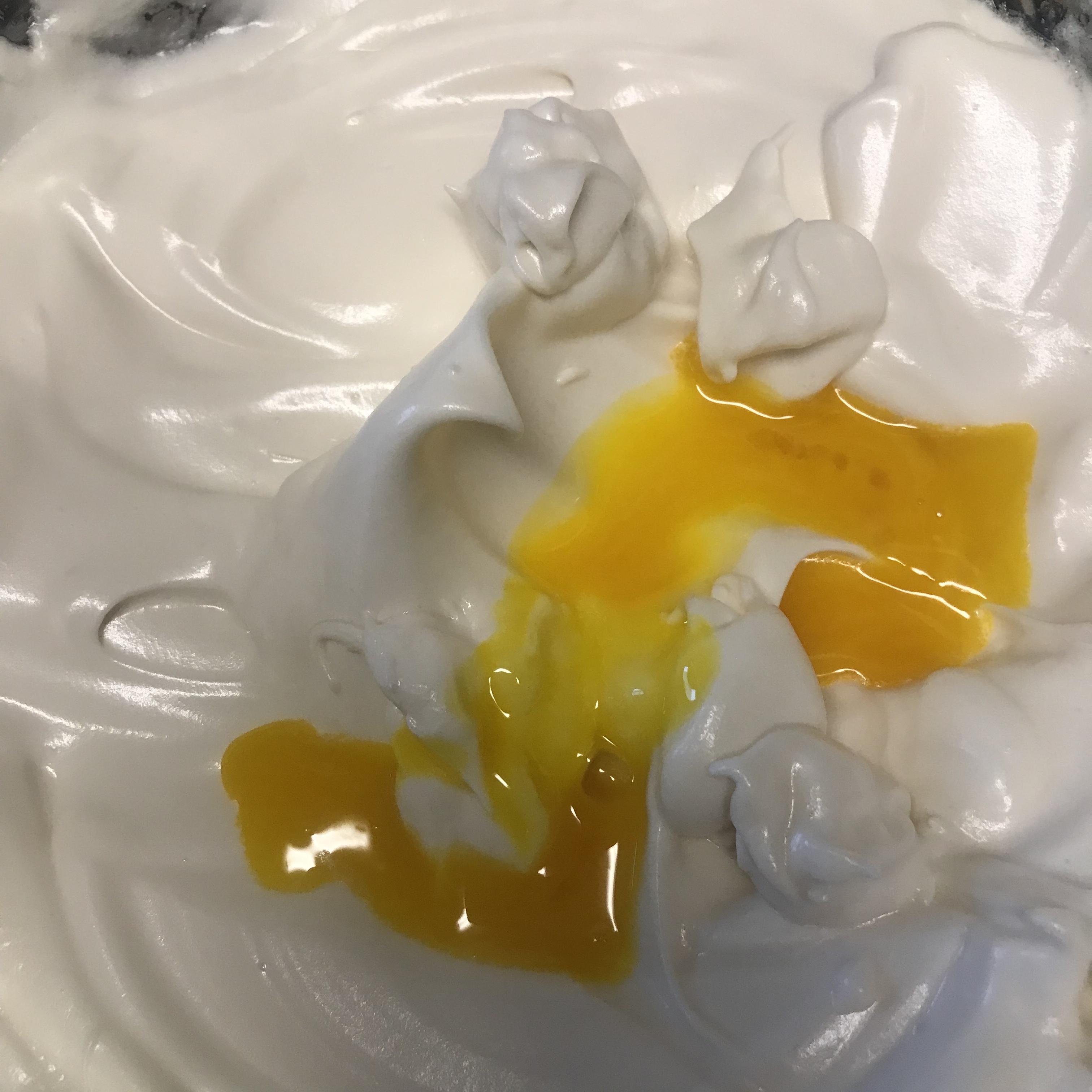 4. 머랭이 완성되면 노른자를 하나씩 넣어 천천히 섞어 줍니다.