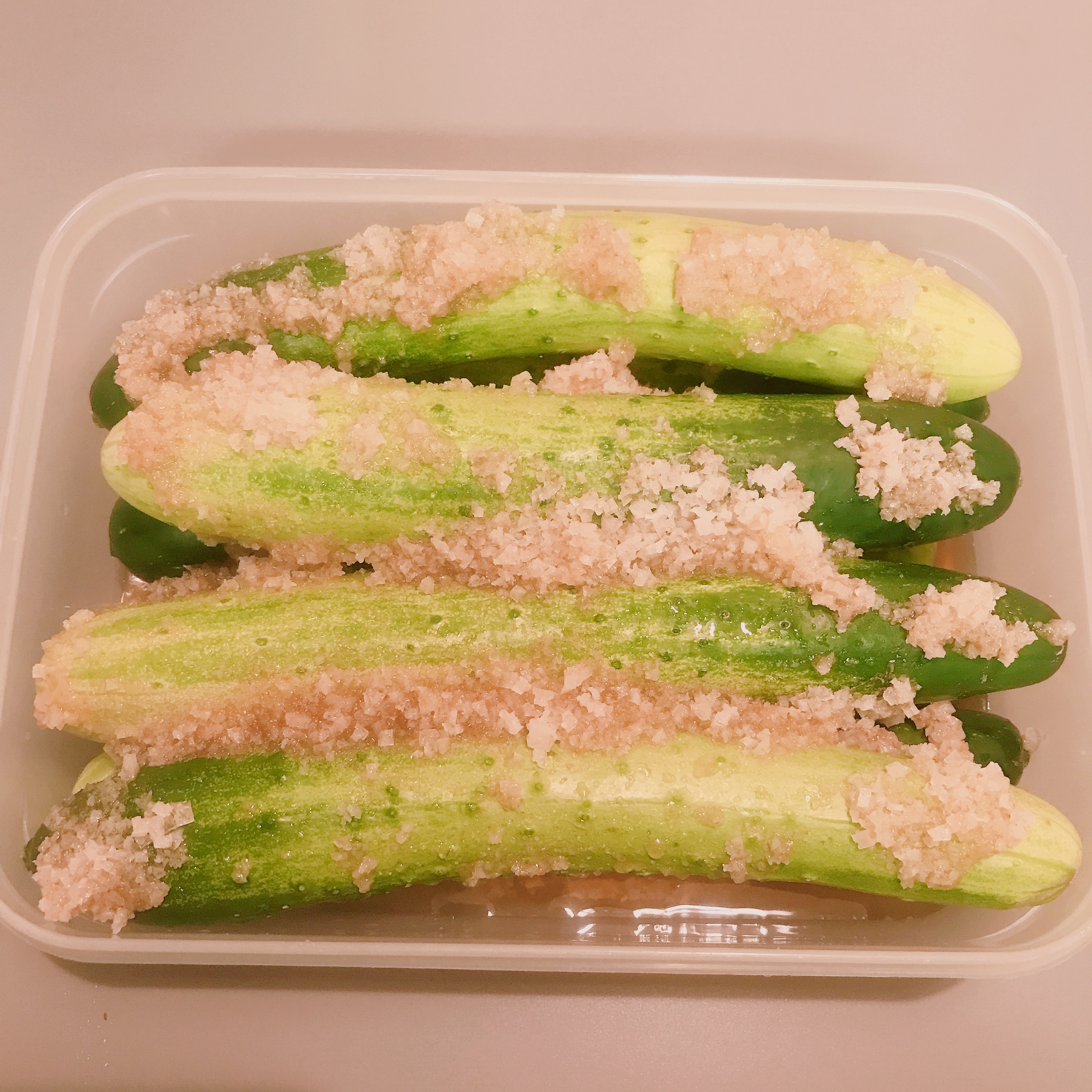 Tip 오이 위로 녹지 않은 천일염이 쌓여 있지만 그대로 두면 삼투압 현상으로 오이에서 수분이 빠지면서 그 물에 자연적으로 녹게 되니 그대로 나 두시면 돼요. 그대로 뚜껑을 닫아 실온에 둡니다, 따로 누름돌 같은 것은 필요 없어요.