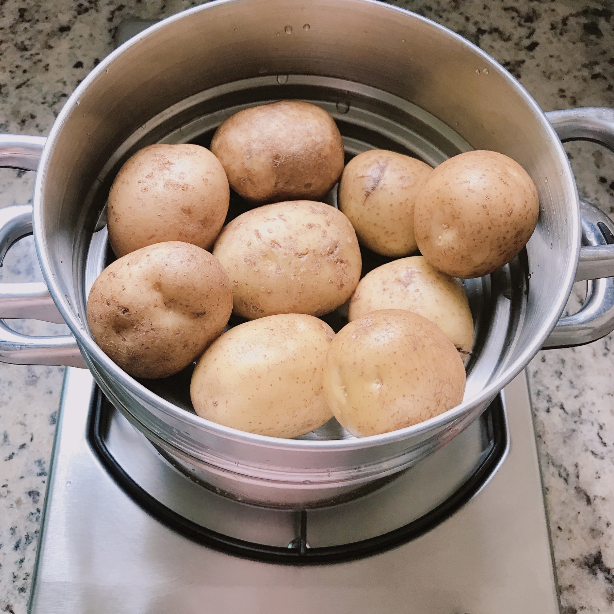 Step 1 감자를 솔이나 수세미로 문질러 깨끗이 씻은 후, 냄비에 물을 받고 찜기를 올려 감자를 넣은 후 뚜껑을 닫고 약 30-40분 정도 끓여 주세요. 감자 크기가 다르거나 겹쳐 넣으면 익는데 시간이 더 걸릴 수도 있으니 젓가락으로 찔러서 익은 정도를 확인해 주세요. 레시피는 감자 4개 기준이지만 저는 감자 한봉 (9입)을 모두 사용했어요.