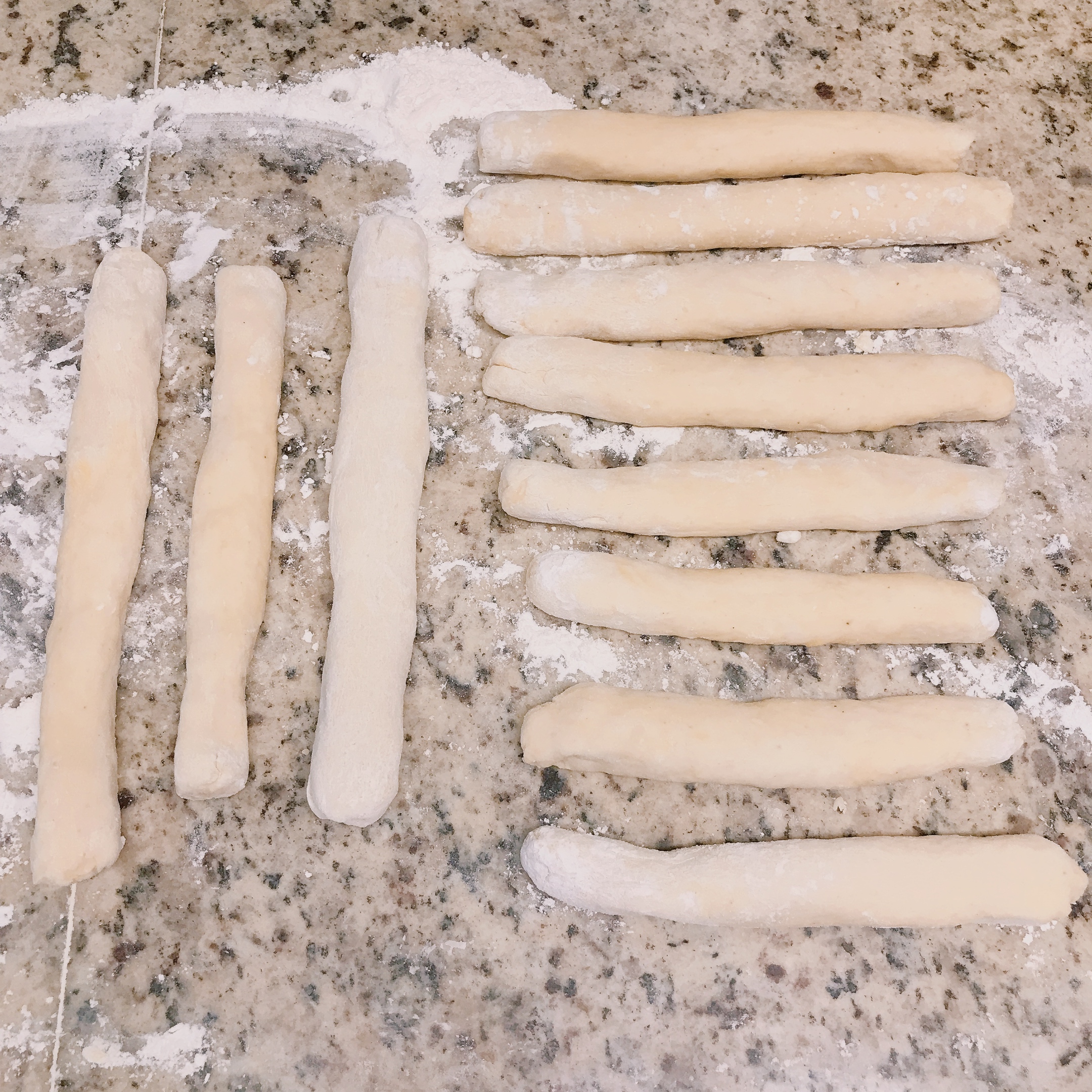 Step 4 도마나 반죽대에 반죽이 붙지 않게 밀가루를 약간 뿌린 후, 완성된 반죽을 한주먹씩 뗘내 가래떡처럼 둥글고 길게 손으로 밀어줍니다.