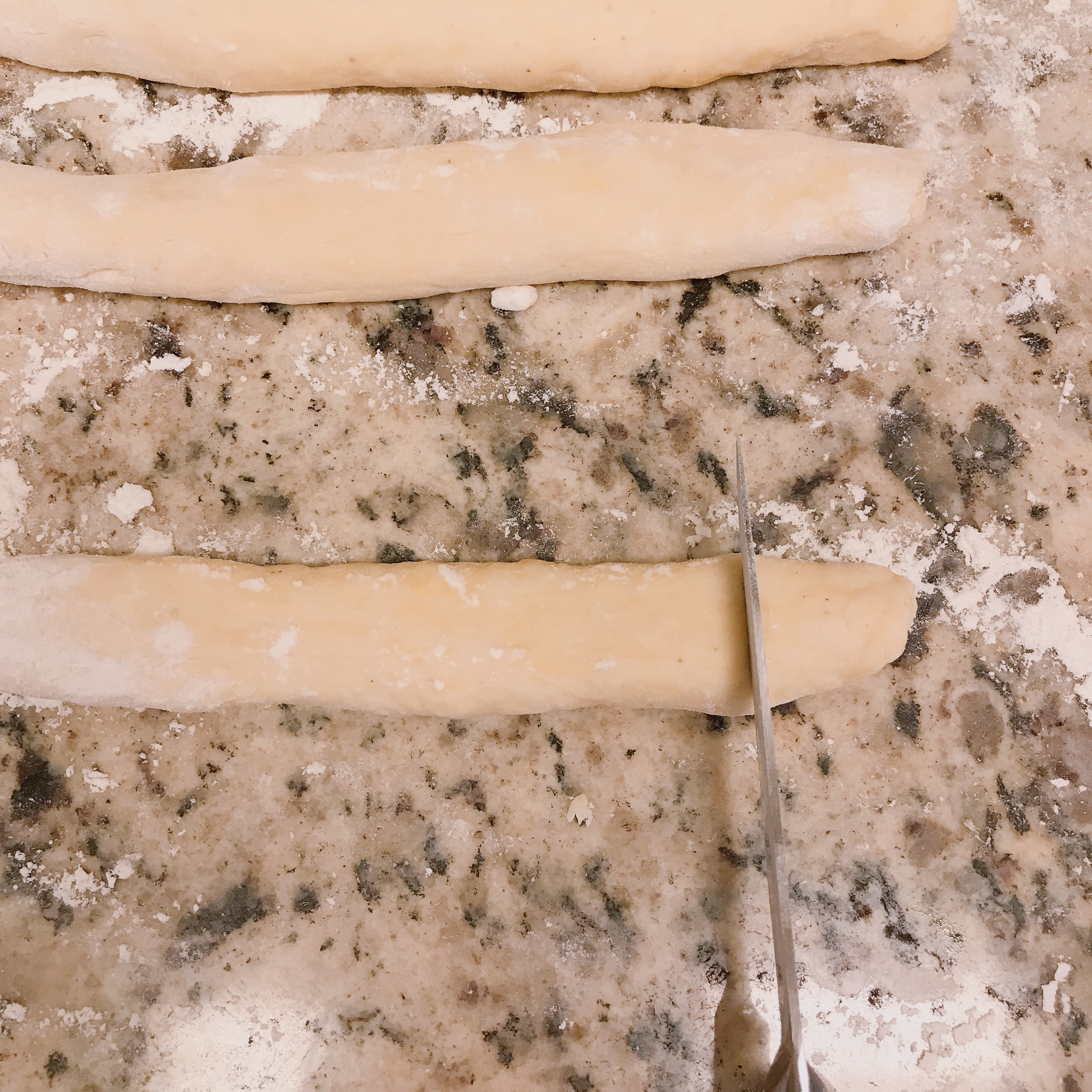 Step 5 가래떡 모양의 반죽을 밀가루를 묻힌 칼을 이용해 1-1.5cm 간격으로 모두 잘라 줍니다.