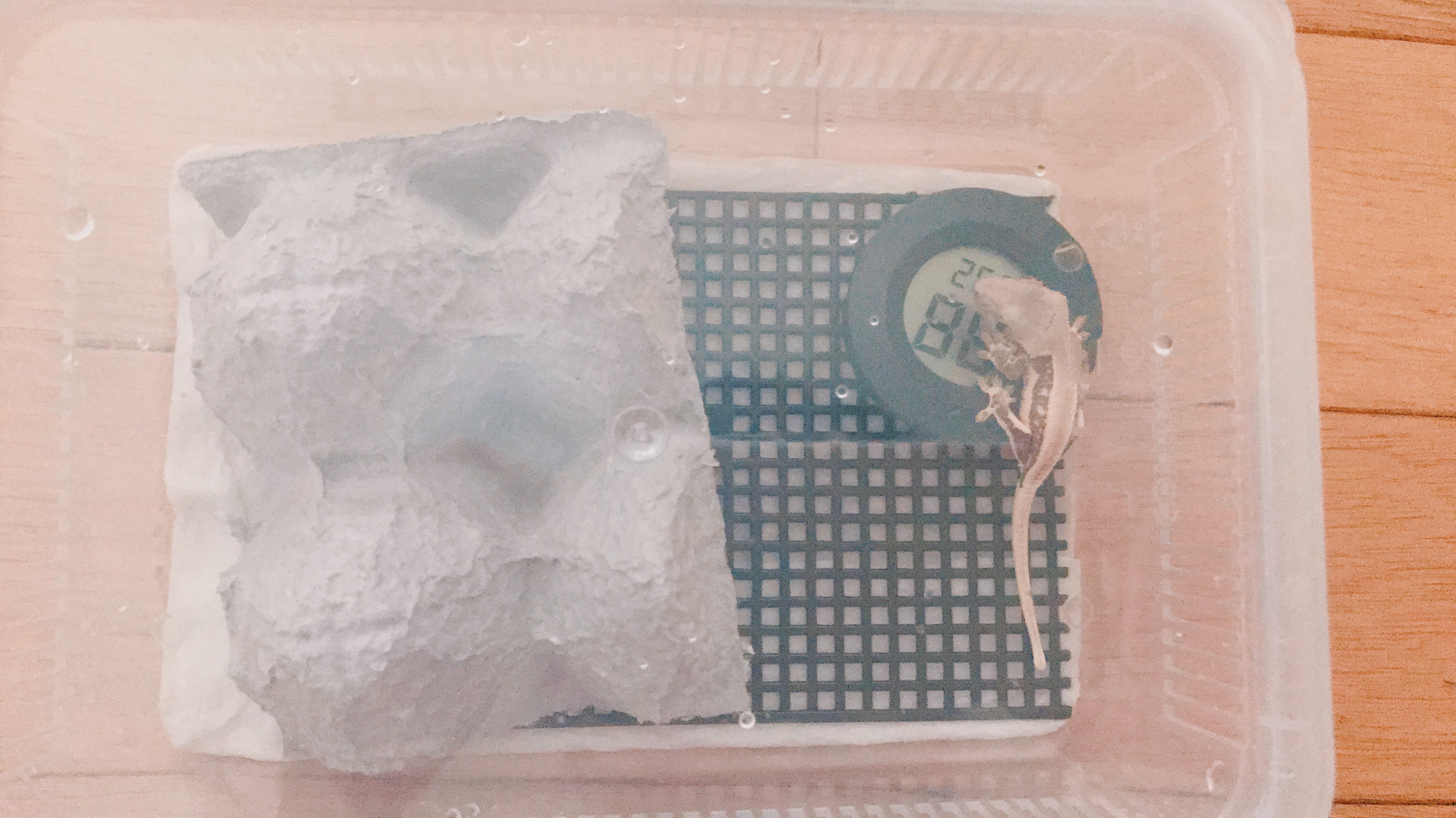 Tip! 습도에 대해서는 국내 유명 브리더 분들도 의견이 조금씩 다르지만 확실한 것은 종일 과습 한 환경은 크레스티드 게코를 피부병이나 기타 질병에 쉽게 노출시킨 다는 것입니다. 분무의 목적은 습도 조절보다는 개체가 벽면의 물방울을 핥아먹어 수분을 보충하는 데 있으므로 분무 후 2시간 정도는 벽면에 물방울이 맺혀 있는 것이 좋으며 이때 바닥은 젖지 않도록 신경 씁니다. 다만 집안 환경에 따라 습도 차이가 있을 수 있으므로 입양 전 사육장 세팅을 하고 온습도계를 넣어 습도를 미리 체크해 보시는 것을 추천합니다