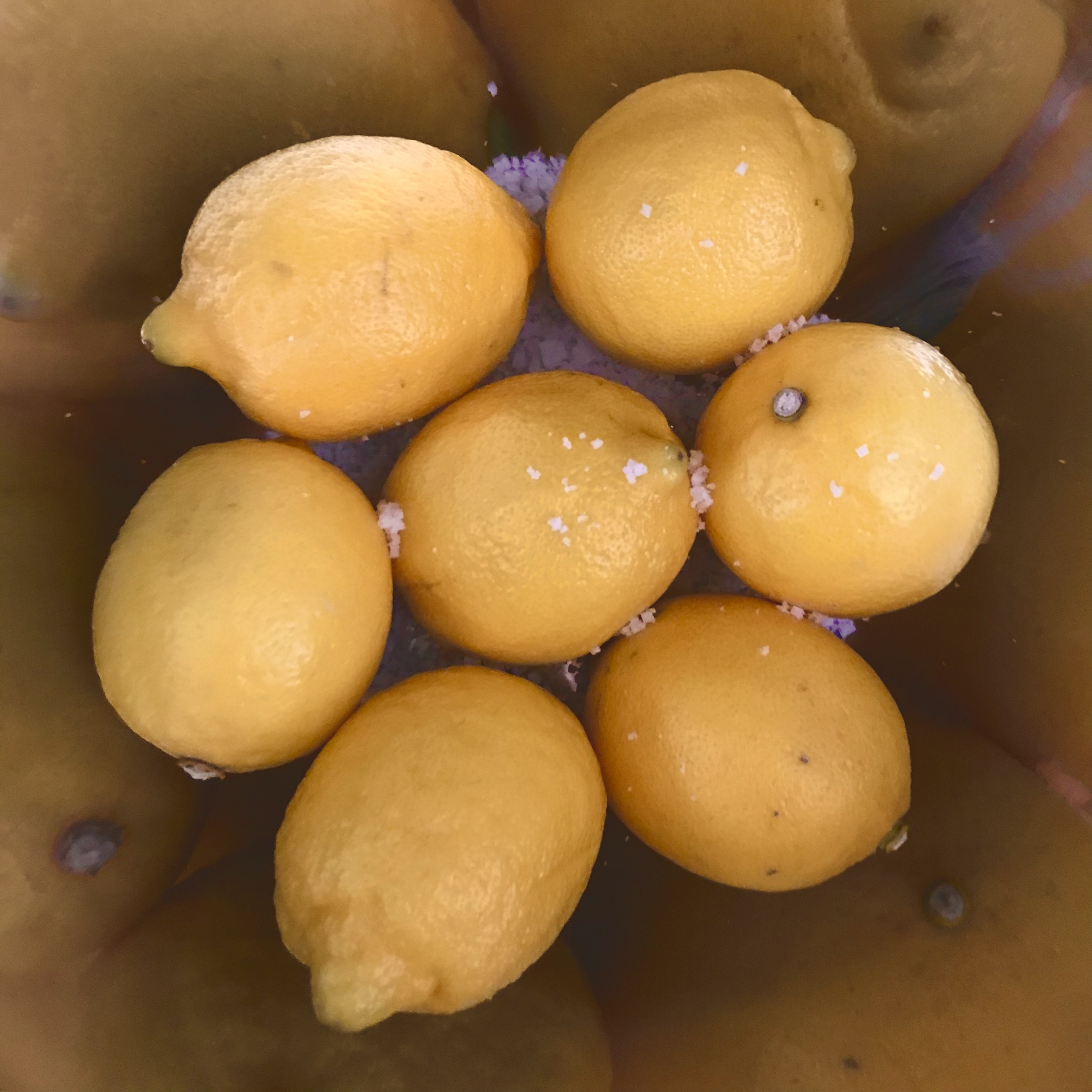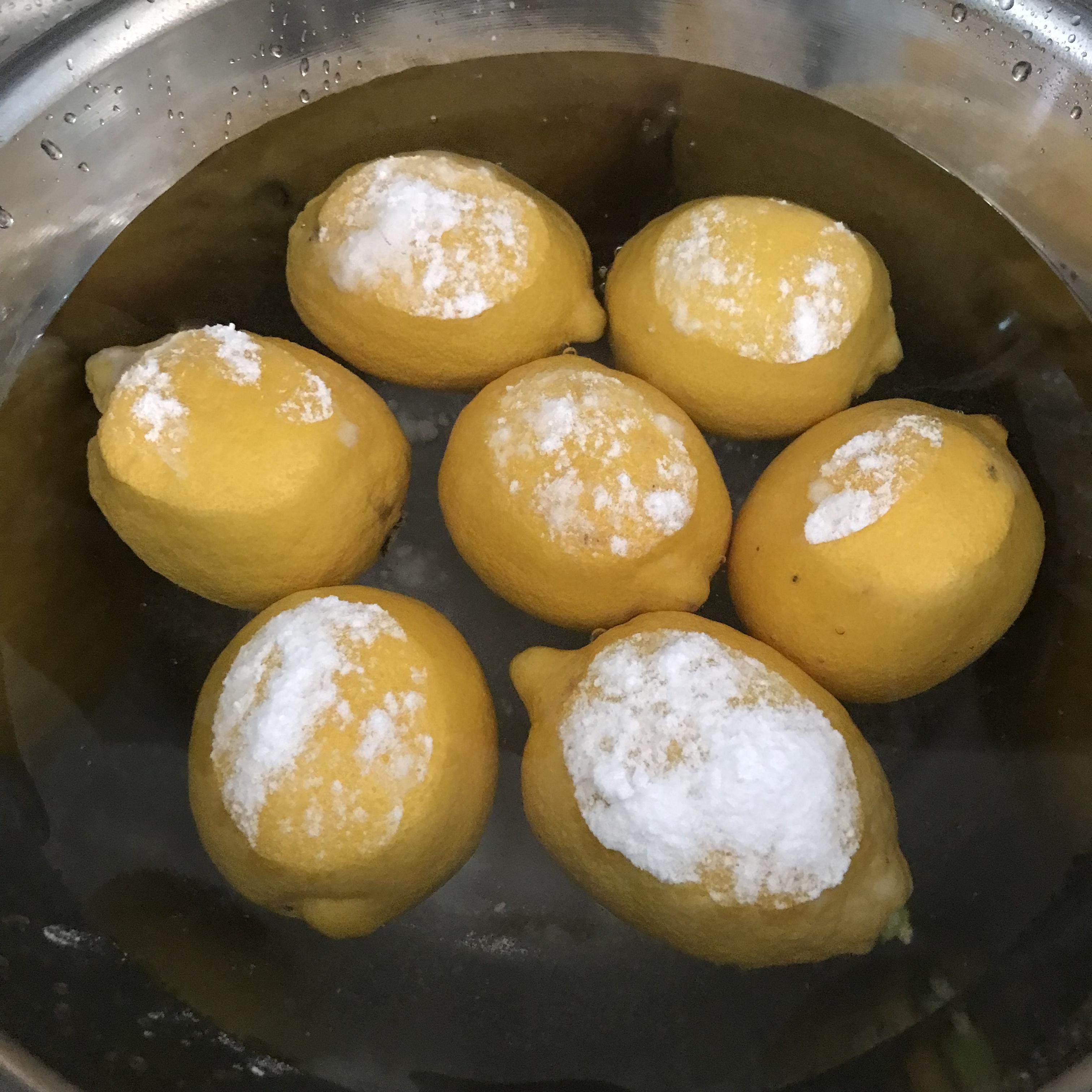 Step 1 레몬에 붙은 스티커는 미리 제거해 주세요. 스테인리스 그릇에 굵은소금 한 줌을 넣은 후, 레몬을 차례차례 넣어 굵은소금으로 겉을 두세 번씩 문질러 줍니다.