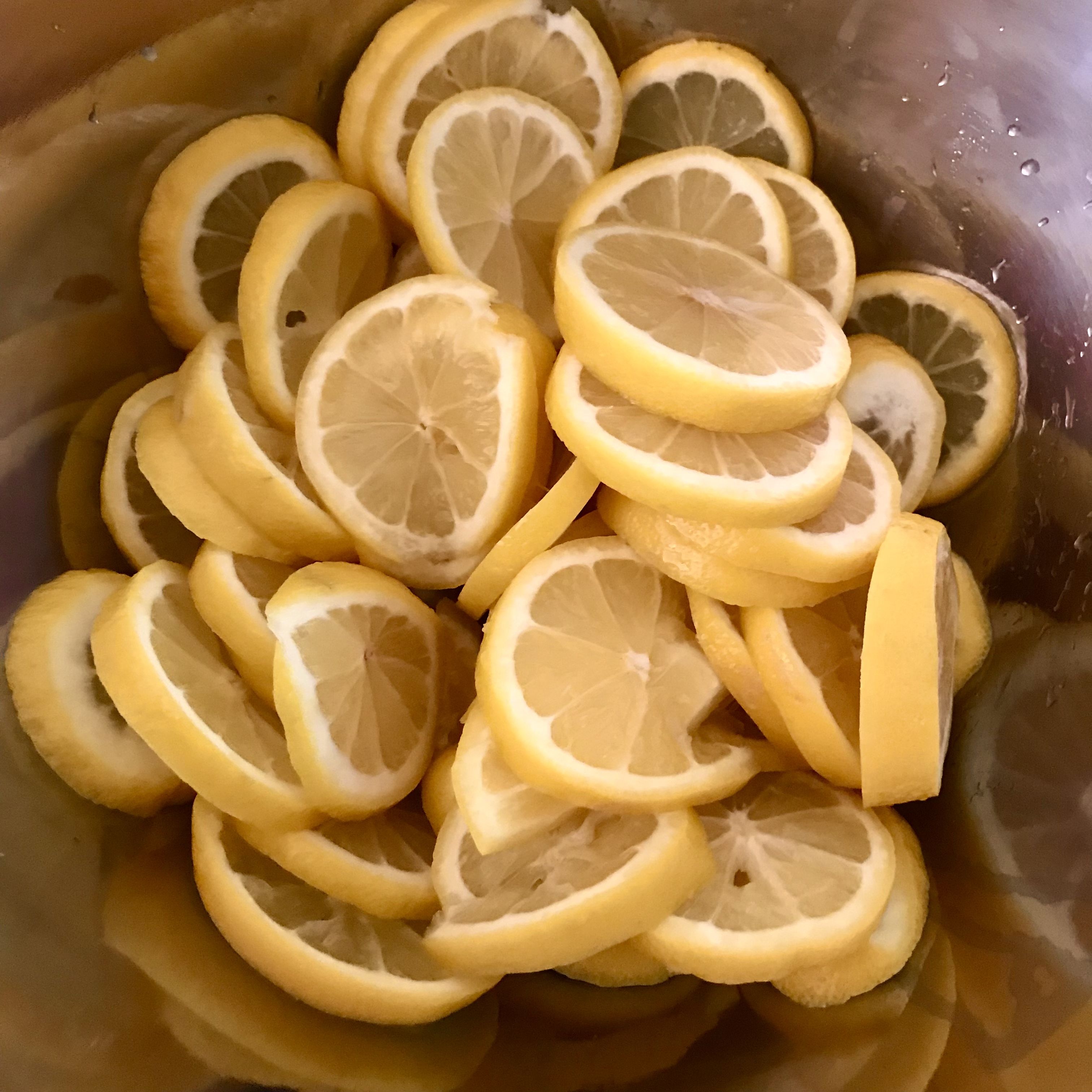 Step 3 냄비에 물이 끓으면 레몬을 넣고 1분 정도 짧게 둥글린 다음, 바로 물을 따라 버리고 레몬은 물기가 마르게 체에 건져 둡니다.