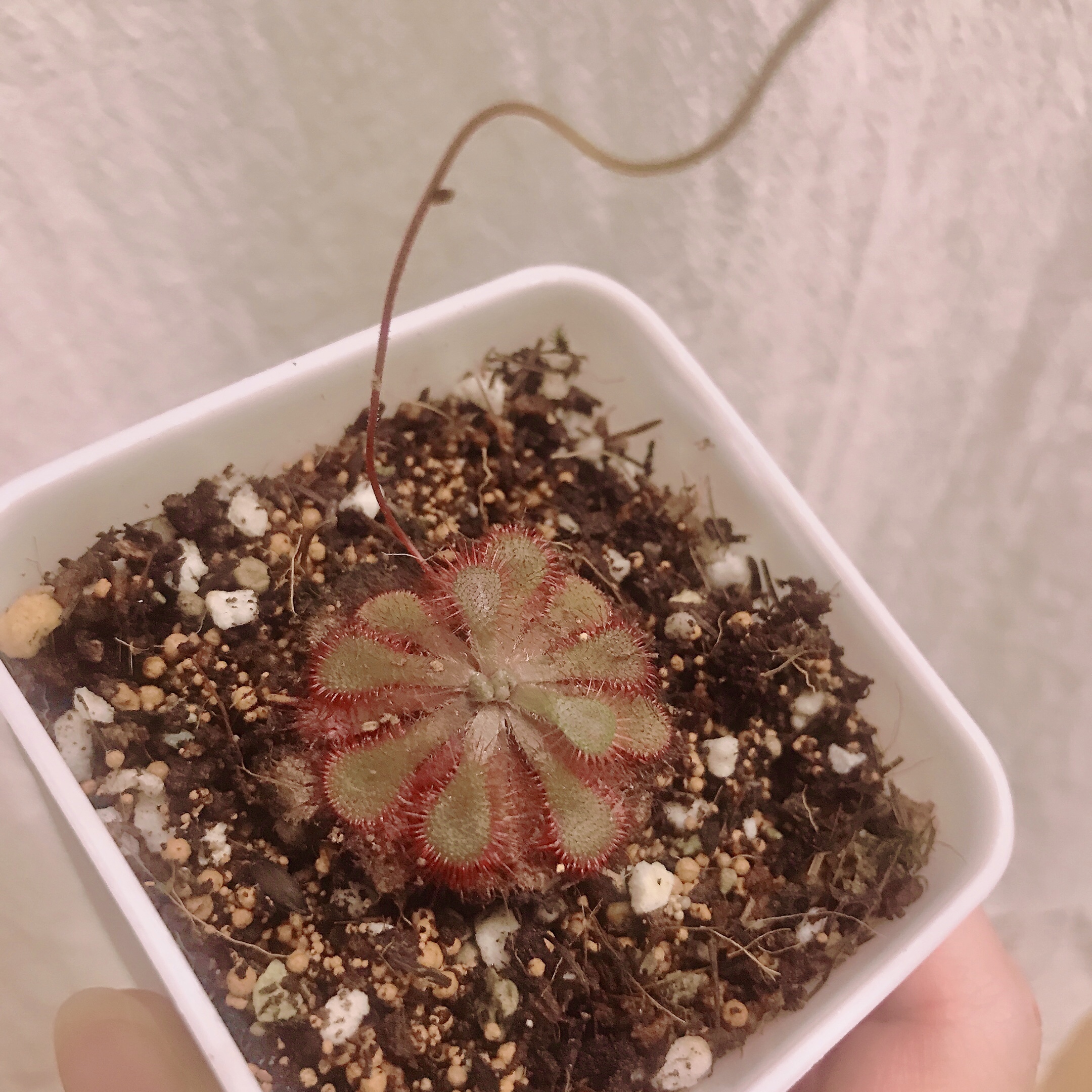 Drosera Filliformis, Green 긴 잎 키다리 끈끈이주걱, 초록 타입 이른 봄 실처럼 길게 자란 이파리가 마치 고사리처럼 말려있다 자라면서 점차 펴지는데, 잎에는 솜털 같은 매우 가는 털들이 사방으로